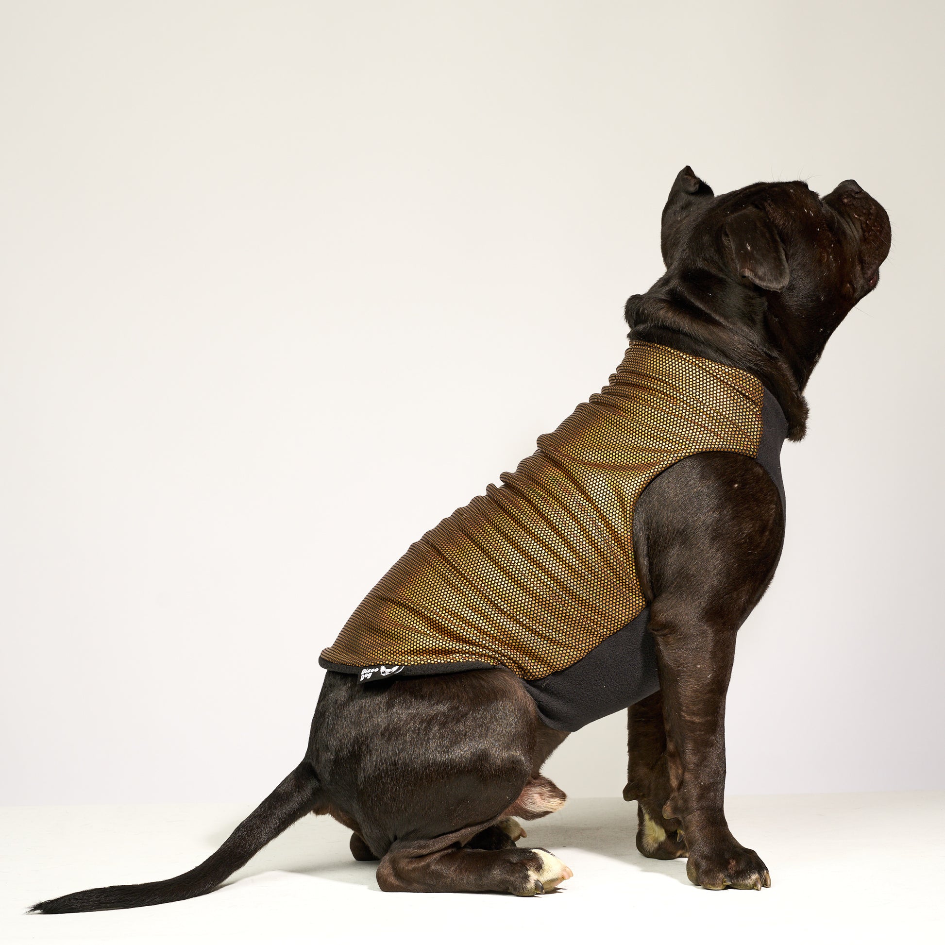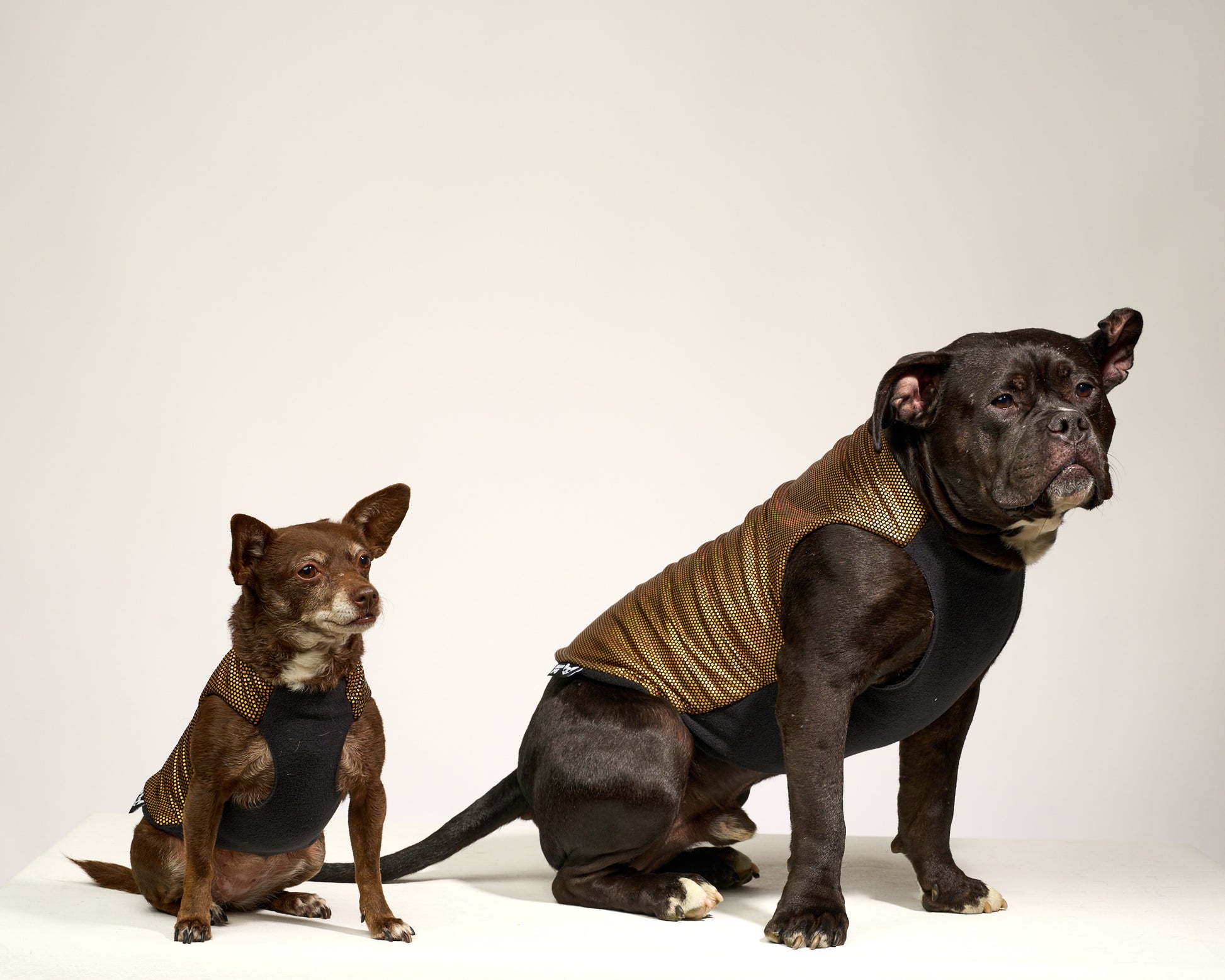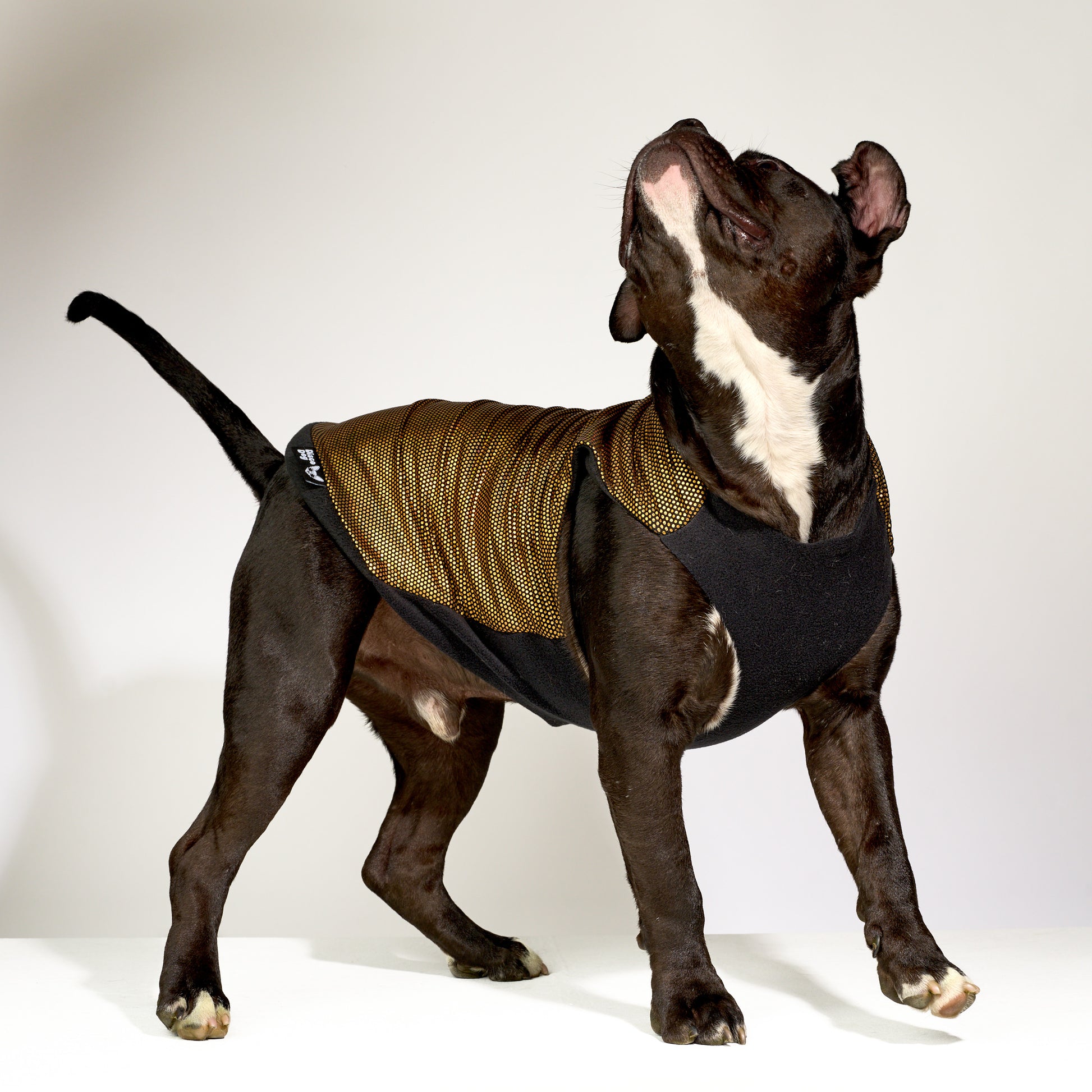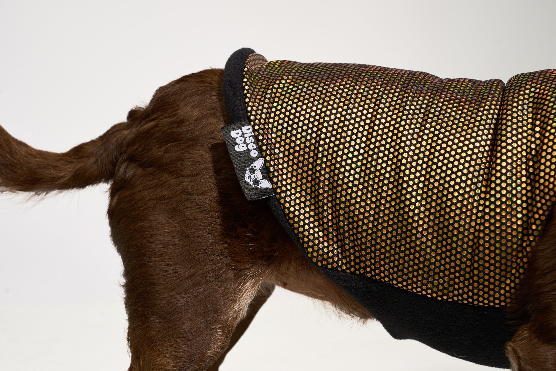 Turn up the heat with the Disco Inferno, a show-stopping dog coat that’s as bold as your pup’s personality. Made with shimmering metallic spandex that shifts between gold, copper, and fiery red, this coat captures the light (and everyone’s attention) with every move. The soft, stretchy black underbody keeps your dog warm and comfortable, while the eye-catching top screams “dance floor ready.”